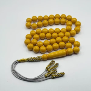 مسبحة باكالايت أصفر داكن عتيق – 51 حبّة – 10 مم مع كركوش سيلفر مع ذهبي