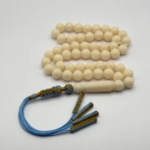 مسبحة باكالايت حليبي فاخر – 51 حبّة – 10 مم مع كركوشة زرقاء و ذهبي