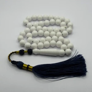 مسبحة باكالايت بيضاء فاخرة – 51 حبّة – 10 مم مع طربوش أسود و ذهبي
